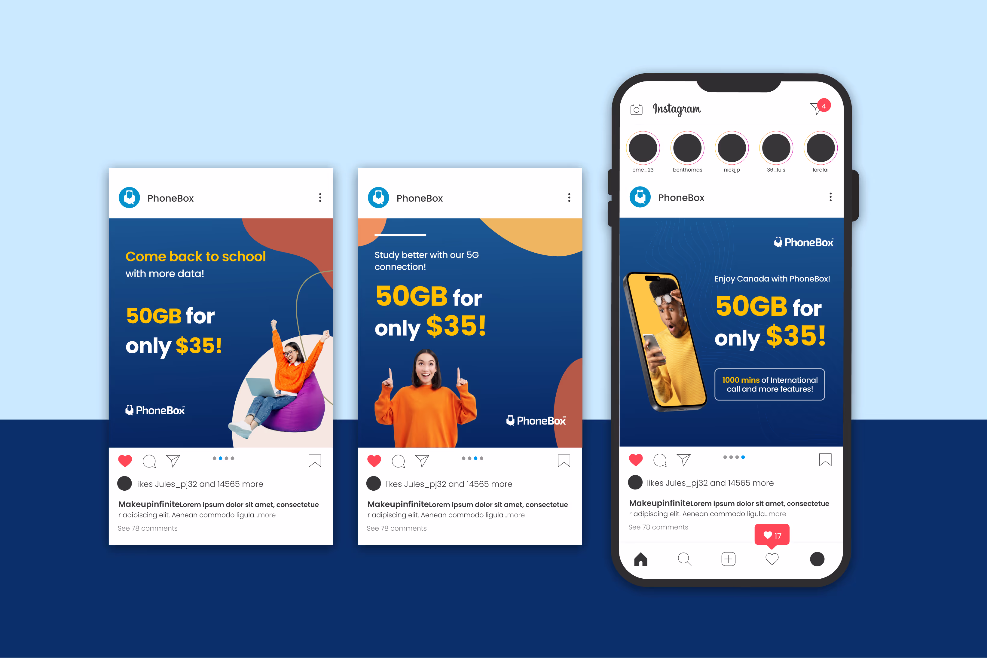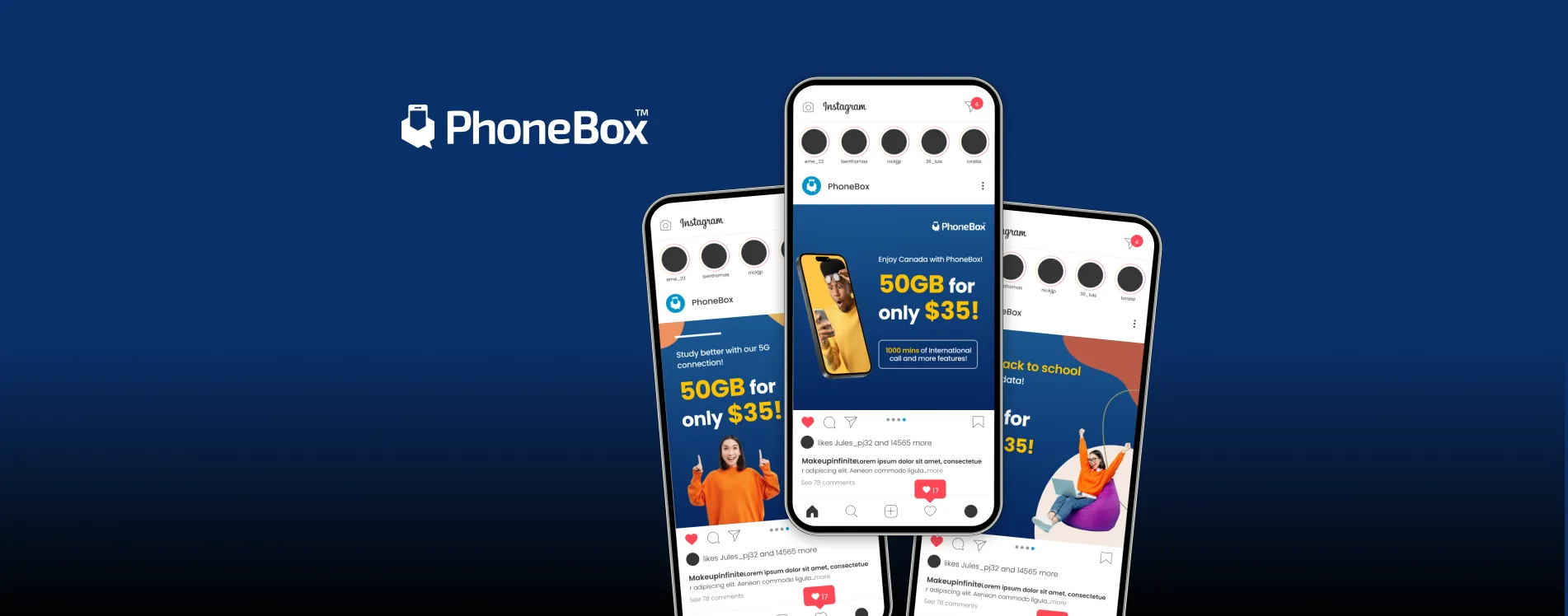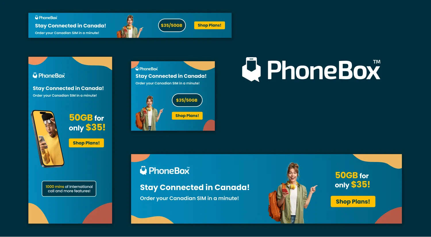 The PhoneBox digital ad campaign targets engagement across websites and Instagram, highlighting seasonal promotions like "Back to School." Instagram ads focus on exclusive deals, appealing to young, mobile-savvy users with savings and convenience. Website ads are optimized in various sizes for banners, sidebars, and pop-ups, ensuring consistent messaging and maximum reach.