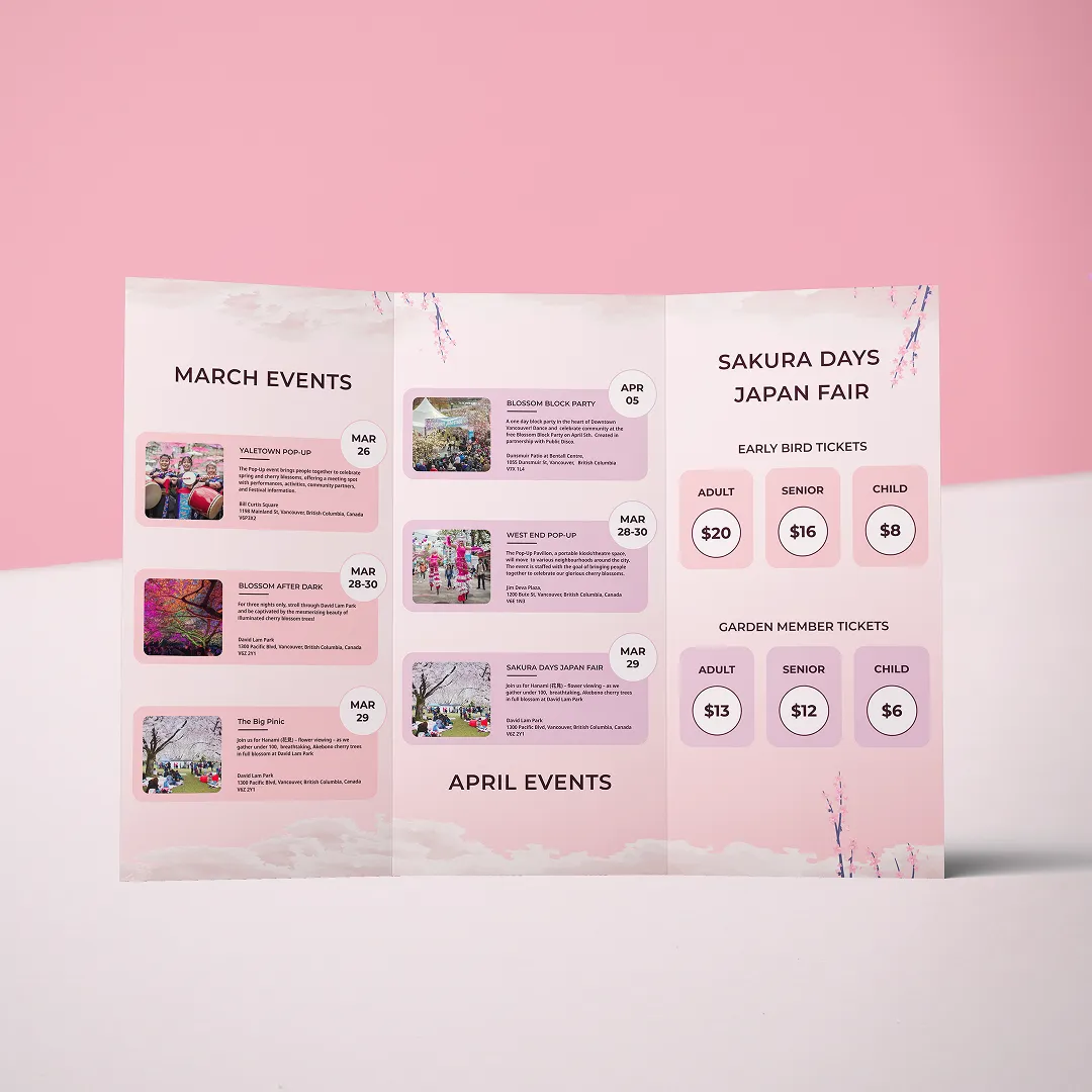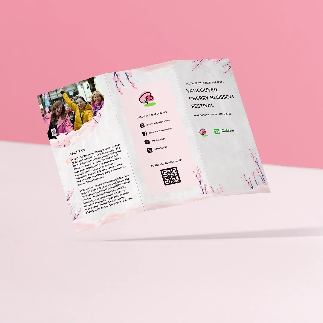 This concept tri-fold brochure was designed to promote the events hosted by the Vancouver Cherry Blossom Festival.